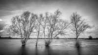 Zwart-witfoto met lange belichtingstijd van een rij bomen die door het hoge water in de Maas bij Bokhoven, in het water zijn komen te staan.