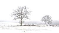 Een landschap met kale eikenbomen en sneeuw. Foto in kleur met hoog contrast waardoor een witte lucht ontstaat. Winter.