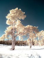 deze prachtige bomen staken mooi af tegen de blauwe lucht en witte sneeuw. Deze foto is gemaakt met een speciaal aangepaste camera. Deze camera registreet niet het gewone licht, maar alleen nog het licht in het Infrarood spectrum. Hierdoor is elke foto weer een verrassing, omdat je niet direct kan zien wat de camera waarneemt. Filters zorgen ervoor dat er gekozen kan worden welke golflengte van het infrarood licht wordt doorgelaten. Door later in de nabwerking het rode en blauwe kanaal om te wisselen wordt de foto omgezet naar een zogeheten "valse kleuren" foto. Het geeft een bepaalde sfeer aan een foto.