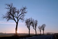 Perspectief rij bomen in de winter bij zonsondergang als silhouetten