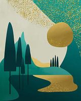 Abstract-minimalistisch landschap met gestileerde bomen, velden en heuvels in de zon. De rijke groenblauw- en groentinten, gecombineerd met gouden kleuren met warm grijs, vertegenwoordigen het basispalet van de natuur: planten badend in zonlicht. De illustratie is tegelijkertijd vredig en speels en kan glamour en sereniteit toevoegen…