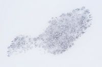 Door het perspectief van de drone is goed te zien waar het eiland met bomen zich bevindt in een verder volledig dichtgevroren en ondergesneeuwd meertje.