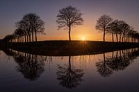 Foto van een bomen rij aan het water in een bocht. Het water is glad, de bomen worden geflecteerd in het water. De zonsondergang geeft het beeld een een mooie vibe. De foto is laag vanaf de waterkant genomen, wat een mooie compositie geeft. Het water gaat de bocht om, wat een mooi effect geeft in de weergave van de bomen. Ik moest heel laag aan het water zitten, riskant, maar het is goed gegaan. De foto is genomen in Witteveen, Drenthe (Nederland).