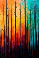 Een fascinerend samenspel van levendige kleuren brengt een mystiek bos tot leven, met torenhoge, donkere silhouetten tegen een stralende zonsondergang. Deze levendige compositie brengt energie en warmte in elke woonkamer, trekt de aandacht en creëert een kalme, meditatieve sfeer. Ideaal voor een uitnodigende sfeer.