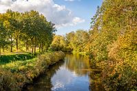 Landschap met bomen in herfstkleuren gereflecteerd in de waterspiegel van een smalle rivier. Het is een zonnige dag met wat wolken aan de blauwe lucht. De foto is gemaakt bij de rivier de Donge bij het dorp 's-Gravenmoer, provincie Noord-Brabant, Nederland.