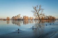De uiterwaarden zijn ondergelopen door het hoge water. Doordat het ging vriezen is een gedeelte van het water bevroren.