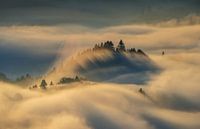 Bomen in mist in Pieniny bergen in zonsopgang licht, Polen