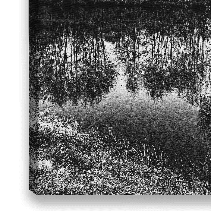 Een rijtje zwartwit bomen aan een plas. Foto gemaakt in de Achterhoek, omgeving Kotten, gemeente Winterswijk.