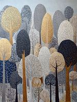 Bomen landschap | Golden Trees - Dit abstracte schilderij toont een betoverend landschap vol unieke bomen met een mix van goud, grijs en wit, die samen een serene en harmonieuze sfeer creëren, perfect voor een modern interieur.