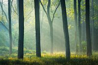 Als je vroeg opstaat kun je in de lente genieten van zonneharpen in het bos. Na een vochtende nacht valt het licht door de bladeren. De symmetrie in deze foto maakt het een rustig beeld om naar te kijken.