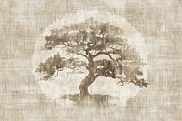 Bomen schilderij | The Solitude of Ancient Growth - Dit bomen schilderij toont een majestueuze, solitaire boom die centraal staat tegen een rustige, textuurrijke achtergrond die het uiterlijk van verweerd pergament imiteert. De boom, met zijn grillige en sierlijk gebogen takken, is rijkelijk bedekt met gebladerte, waardoor een indrukwekkend schouwspel van licht en schaduw ontstaat. Het licht lijkt door de dichte bladerkroon te breken en vormt heldere vlekken die de vormen van de bladeren accentueren. De scène wordt omgeven door zacht uitgebeeld ondergroei en enkele kleine bomen of struiken in de verte, wat bijdraagt aan het gevoel van diepte en natuurlijke schoonheid. Het kleurenpalet is beperkt tot verschillende tinten sepia, wat een gevoel van warmte en tijdloosheid oproept. Het geheel geeft blijk van een serene en contemplatieve uitstraling, waardoor dit natuur schilderij zowel rustgevend als esthetisch aangrijpend is.