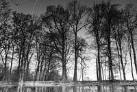 Je kijkt naar een weerspiegeling van bomen in het water, de foto is 180 graden gedraaid. Dit geeft een bijzonder effect. Als je goed kijkt zie je de takken in het water liggen. Prachtig kunstzinnig effect in zwart wit. Schitterend in diverse interieurs en passend bij meerdere trends. Waaronder ook de nieuwe trend in aarde tinten, dichtbij de natuur, die mooi te combineren is met zwart wit