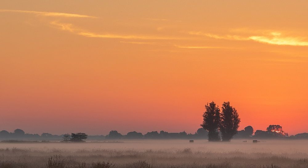 Dit rijen bomen staan vlakbij bij het dorpje Bleskensgraaf in zuid. je ziet een paar bomen staan die net voor zonsopkomst in de mist ziet staan en daar boven hangen nog wat sluierbewolking die door de zon word belicht.