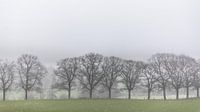 Bomen op een rijtje vlakbij Gulpen op een mistig ochtend