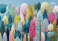 Bomenkleurenspel | Tree Party - Dit kleurrijke bomen schilderij toont een levendige verzameling van abstracte bomen in frisse kleuren, waarbij de dominantie van roze, groen en blauw een speelse en vrolijke sfeer creëert.