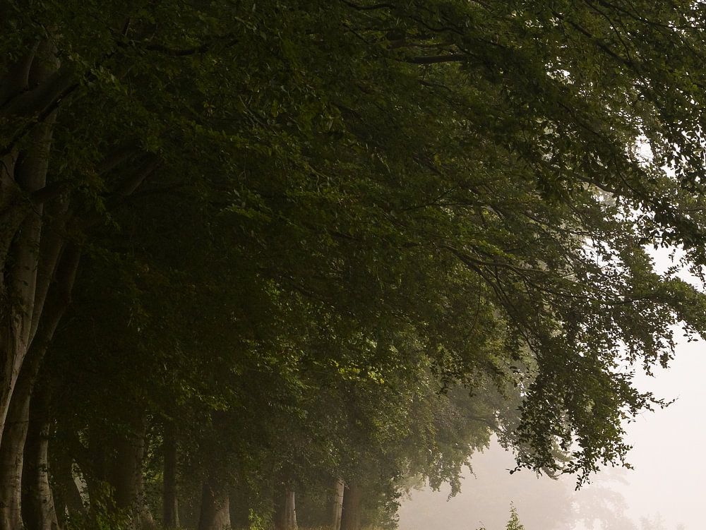 Mooie beukenlaan aan een lege akker met in de verte enkele bomen in de mist. De zon komt juist even door en verlicht het pad zodat er een opening, een belofte, ontstaat.