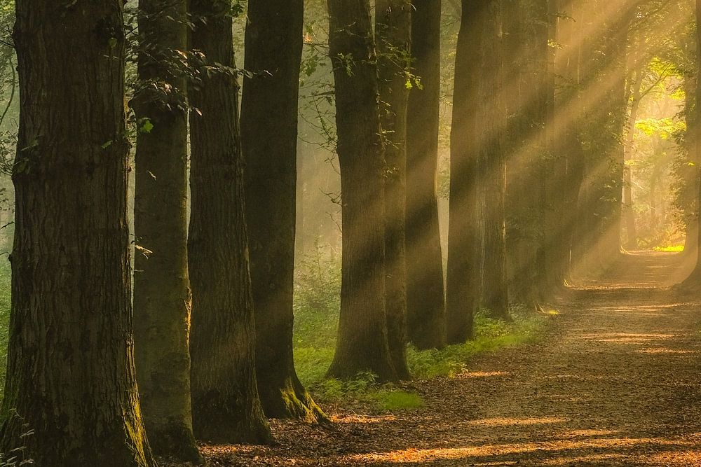De bomen in deze laan zijn hoog en statig, hun takken vormen een dicht bladerdak dat het zonlicht filtert. Terwijl de zonnestralen door de bladeren breken, ontstaan er schitterende zonneharpen op de grond. Het lijkt alsof de bomen muziek maken met het licht, en de stralen dansen als glinsterende noten op de bodem van de laan.