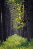 Een statische eikenlaan is vol gegroeid met gras. Het zonlicht komt laag van opzij waardoor de sfeer bijna sprookjesachtig wordt. Het licht is warm en zacht.