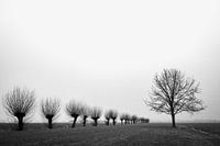 De omgeving van Werkhoven op een nevelige winterdag. De lucht is eenvormig, de enige structuur wordt gevormd door de rij wilgen, met daarnaast die eenzame boom.