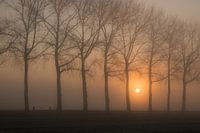 Zonsopkomst tussen fraaie bomenrij gehuld in mist. Typisch landschapstafereeltje uit de Betuwe.