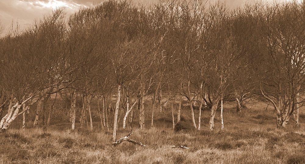 Een prachtige rij bomen met een dreigende en mooie lucht erboven.