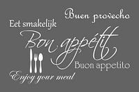 Dit stijlvolle typografische kunstwerk met de tekst "Bon Appétit" in verschillende talen heeft een diepe donkergrijze achtergrond en strakke witte letters, wat zorgt voor een moderne en verfijnde uitstraling. De rijke grijze tint straalt rust en elegantie uit, waardoor dit werk perfect past in een eetkamer, keuken of andere ruimte waar gezelligheid en maaltijden centraal staan. Het contrast tussen de donkere achtergrond en de heldere witte letters maakt de boodschap krachtig en visueel aantrekkelijk.