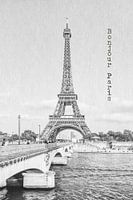 Met zijn 324 meter domineert de Eiffeltoren in Parijs het stadsbeeld. Het is een van de meest bezochte bezienswaardigheden ter wereld. Klassieke monochrome impressie van de Seine met de typografie "Bonjour Paris". Fantastisch stadsmotief uit een serie verdere stadsimpressies uit mijn collectie "Paris Stories".