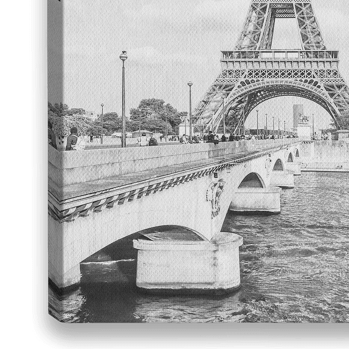 Met zijn 324 meter domineert de Eiffeltoren in Parijs het stadsbeeld. Het is een van de meest bezochte bezienswaardigheden ter wereld. Klassieke monochrome impressie van de Seine met de typografie "Bonjour Paris". Fantastisch stadsmotief uit een serie verdere stadsimpressies uit mijn collectie "Paris Stories".