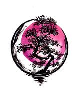 Aquarel en inkt kunstwerk van een Japanse bonsai die groeit in een Enso cirkel met een grote rode zon op de achtergrond.