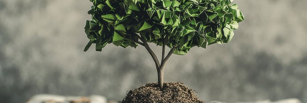 Dit panorama toont een compacte, bonsai-achtige boom met donkergroene bladeren, allemaal zorgvuldig gevouwen uit papier. De boom staat stevig op een rotsachtige ondergrond, wat kracht en stabiliteit symboliseert. De achtergrond is neutraal en zorgt ervoor dat de boom extra opvalt. Deze afbeelding combineert natuurlijke vormen met een grafische uitstraling, en is daarmee perfect voor moderne interieurs. De panorama-verhouding zorgt voor een uitgebalanceerd beeld dat rust en diepte geeft aan je wanddecoratie. Ideaal voor in een werkkamer, woonkamer of galerijwand. Geef je ruimte een creatieve touch met deze originele blikvanger.