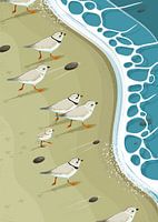 Deze illustratie toont een groep bontbekplevieren die de kustlijn volgen, altijd op zoek naar voedsel dat door de golven naar de kust wordt gespoeld. Als je goed kijkt, zie je ook een jong dat naast de volwassen vogels loopt, een klein, charmant detail dat de natuurlijke sociale dynamiek van deze vogels…