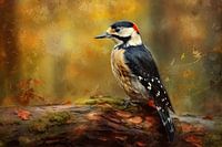 Trefwoorden: bonte specht schilderij, herfst vogel kunst, specht wanddecoratie, impressionistisch vogelschilderij, zwart wit specht schilderachtig, tuinvogels schilderkunst, vogel op boomstam kunst, herfstbos decoratie, landelijke vogelkunst, karaktervolle specht