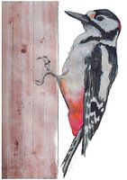 Dit is een print van een originele tekening van een specht welke gemaakt is met acrylverf oostindische inkt, aquarelverf en oliepastel.