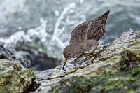 De bonte strandloper is een vaak geziene gast op de pier van IJmuiden. Door de groene algen op de rotsen en de zee die eromheen klotst, blijft er veel te eten liggen.