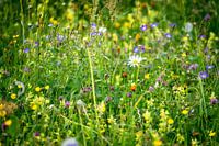 In een bont bloeiende weide staan talloze bloemen zoals paardebloem, boterbloem, klaver. Eén stralend witte margriet trekt alle opmerkzaamheid naar zich toe.
