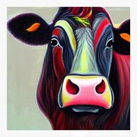 Een kunstwerk is een kleurrijke digitale tekening van een koe, die het boerenleven in Nederland vertegenwoordigt. Het beeld van een koe is zeker iconisch voor de Nederlandse boerderijen en het platteland, en het gebruik van heldere kleuren brengt het nog meer tot leven.