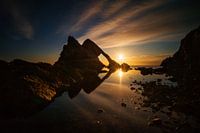 Boog Fiddle Rock reflectie in zonsopgang licht, Portknockie, Schotland