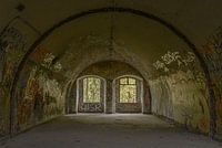Een vertrek met een boog, vol met graffiti en twee ramen, in een verlaten fort in België