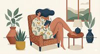 In dit verstilde interieurmoment zit een vrouw comfortabel in een fauteuil verdiept in een boek. Omringd door kamerplanten, zachte vormen en warme kleuren ontstaat een intieme sfeer van rust en concentratie. Het werk viert de waarde van tijd voor jezelf: een stil ogenblik waarin de buitenwereld even vervaagt en alleen het verhaal en het…