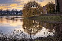 Ondergaande zon aan de Maas bij het Limburgs Gouvernement in Maastricht (Limburg, Nederland). De laagstaande zon zorgt voor een mooie reflectie in het water van deze boom.