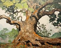 Boom Schilderij | Robuuste Boom met Groene Bladeren - Op dit boom schilderij zie je een grote, krachtige boom met een robuuste stam en veel groene bladeren, omringd door een zachte achtergrond van bomen en bladeren.