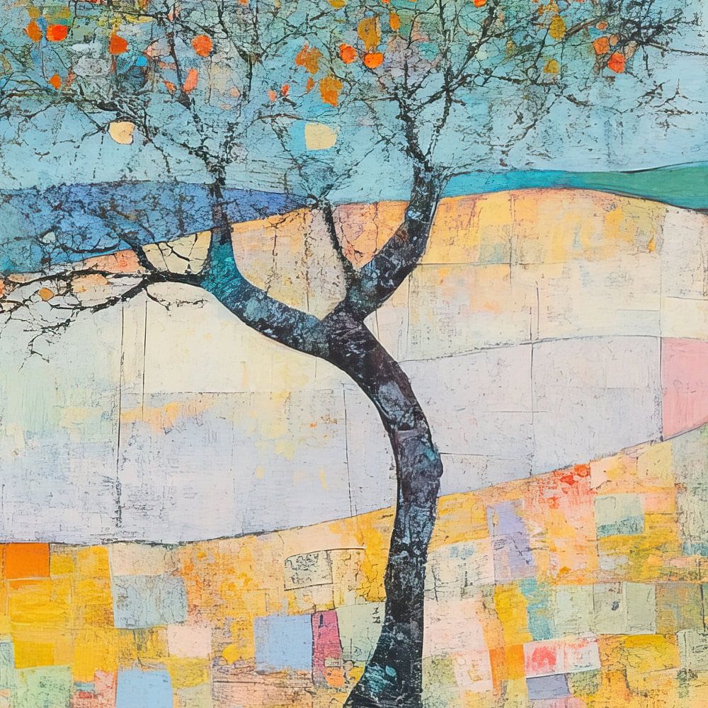Boom Vruchten - Op dit landschap schilderij zie je een boom met kleurrijke vruchten die duidelijk afsteekt tegen een achtergrond van soepele kleuren en vlakken, wat een vrolijke en levendige sfeer creëert.