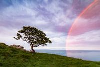Een eenzame boom staat aan de kust van Ierland en er is een regenboog bijgekomen.