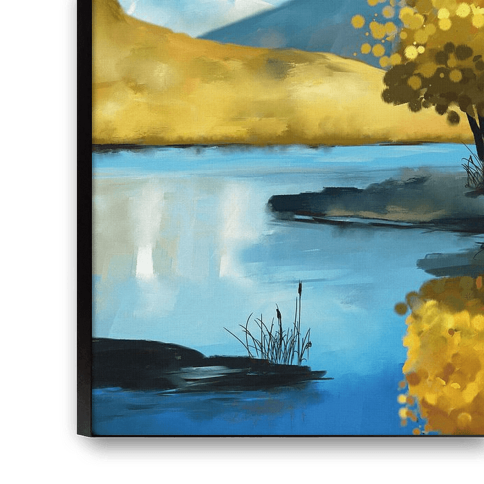 Digitaal acrylschilderij van een landschap in de lente, met een boom in geel-groene kleuren bij een rivier. De boom wordt gereflecteerd in het blauwe water. De kleuren blauw en geel-groen vormen een mooie en interessante contrast.