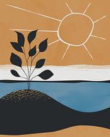 Minimalistische illustratie van een gestileerde boom bij een meertje or rivier op een zonnige dag. Het palet van vervaagde kleuren en de voornamelijk horizontale vormen creeeren een vredige uitstraling. De kleuren zijn beperkt tot lichtgrijs, oranje, blauw en donkerbruin.