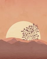 Minimalistisch landschap met een boom, velden en de ondergaande zon op de achtergrond. De kleuren zijn beperkt tot varianten van vervaagd oranje en lichtgeel voor de zon. Aquareltexturen zorgen voor interessante effecten.
