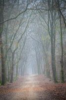 Boom en bospad in de mist in het speulderbos Ermelo Nederland Holland.