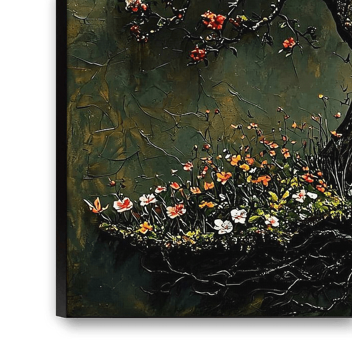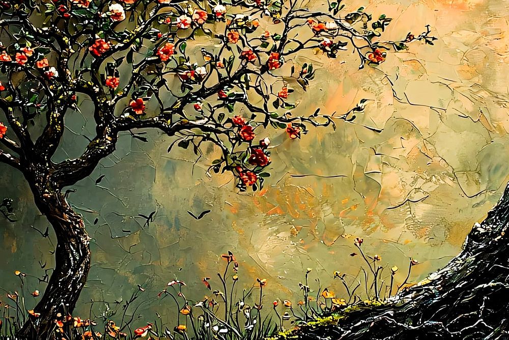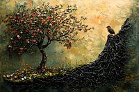Dit prachtige schilderij toont een serene boom vol bloemen tegen een rustieke achtergrond. Een kleine vogel zit vredig op een heuvel, wat een gevoel van balans en harmonie creëert. Het subtiele kleurgebruik en de fijne details zorgen ervoor dat dit kunstwerk perfect past in elke ruimte. Een tijdloze toevoeging die zowel rustgevend als visueel boeiend is. Perfect voor natuurliefhebbers en kunstkenners.