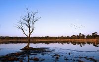 Een solitaire boom en zwerm vogels in een Brabants ven.