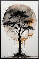 Een abstract aquarel van een solitaire boom, met een draaiende cirkel er omheen. De cirkel bestaat uit inkt, pastelkleur, en deze inkt druipt op de boom waardoor deze langzaam verdwijnt. Het beeld is met behulp van ai gegenereerd.